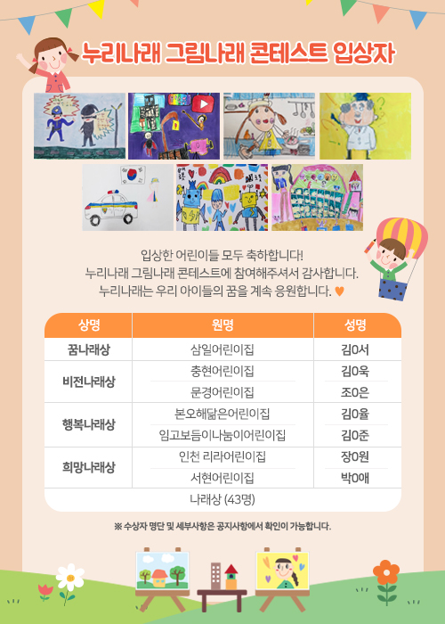 누리나래 그림나래 콘테스트 입상자 발표 페이지 정보 작성자 아이렘 댓글 0건 조회 4,090회 작성일 22-06-13 12:45 본문 누리나래 그림나래 콘테스트 입상자를 발표합니다. 입상한 어린이들 모두 축하합니다! ※ 꿈나래상, 비전나래상, 행복나래상, 희망나래상 수상자에게는 상장과 꿈을 응원하는 깜짝 선물, 나래상 수상자에게는 상장이 원으로 배송됩니다.(선물은 6월 17일 이후 발송될 예정이나 물류상황 상 변동될 수 있는 점 양해 부탁드립니다 ^^)입상자 명단 확인해 주시어 이름이 맞는지 한 번 더 확인 부탁드립니다. 첨부파일 2022년 수상자 명단.pdf (41.8K) 2436회 다운로드 | DATE : 2022-06-13 12:45:21 2022년 수상자 명단.hwp (128.0K) 2262회 다운로드 | DATE : 2022-06-13 12:45:21 목록 이전글메이커아트 7호 1단계 '밥도둑' 변경 안내 22.09.07 다음글그림나래 콘테스트 당첨자 발표 연기 안내 22.06.02 댓글목록 댓글목록 등록된 댓글이 없습니다.