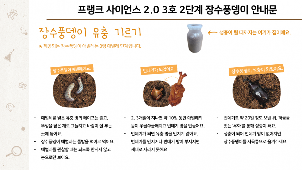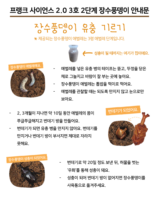 프랭크 사이언스 2.0 3호 2단계 장수풍뎅이 안내 페이지 정보 작성자 아이온 댓글 0건 조회 3,544회 작성일 23-04-28 16:51 본문 안녕하세요. 아이온에듀 X 레몬에듀입니다.프랭크 사이언스 2.0 3호 2단계에는 장수풍뎅이가 제공됩니다.키우실 참고하실 수 있도록 생태 안내문을 제공하오니 참고 부탁드립니다.- 프랭크 사이언스 2.0 > 공지사항에도 확인하실 수 있습니다.감사합니다. 목록 이전글누리나래 그림나래 콘테스트 입상자 발표 23.06.12 다음글2023 그림나래 콘테스트 안내 23.04.18 댓글목록 댓글목록 등록된 댓글이 없습니다.