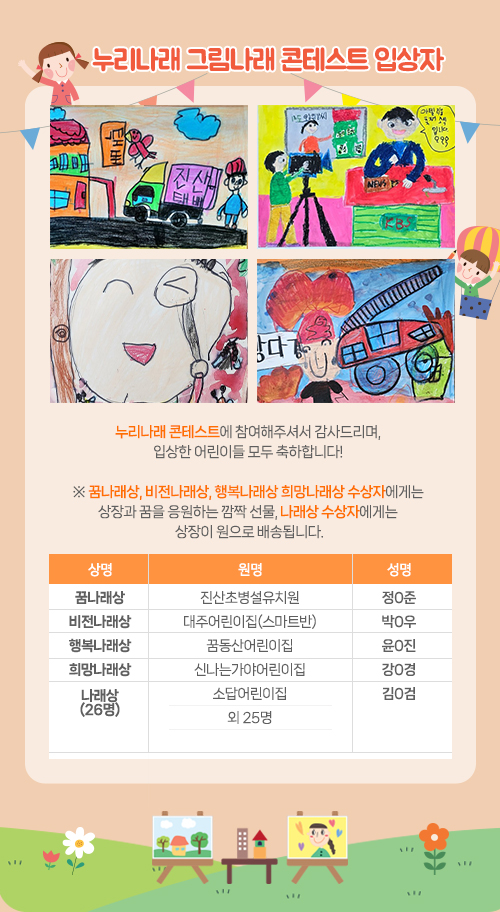 누리나래 그림나래 콘테스트 입상자 발표합니다! 페이지 정보 작성자 아이온 댓글 0건 조회 2,857회 작성일 24-06-12 13:32 본문 누리나래 그림나래 콘테스트 입상자를 발표합니다. 누리나래 그림나래 콘테스트에 참여해주셔서 감사합니다.누리나래의 우리 아이들의 꿈 응원은 계속됩니다.입상한 모든 어린이들 축하합니다!- 추후 상장과 택배가 원으로 전달 되기에 (예정 : 6월 말~ 7월 초) 입상자들의 원명과 이름을 꼭 확인해주시고수정사항이 있으시면 1544-2109로 연락 주시길 바랍니다. 첨부파일 2024 입상자 명단.hwp (61.0K) 1770회 다운로드 | DATE : 2024-06-12 13:32:18 목록 이전글2025 누리나래 그림나래 콘테스트 입상자 발표합니다! 25.06.17 다음글누리나래 그림나래 콘테스트 입상자 발표 23.06.12 댓글목록 댓글목록 등록된 댓글이 없습니다.