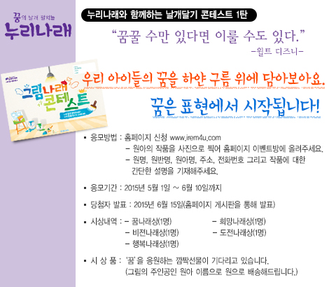 누리나래 그림나래 콘테스트 공지 페이지 정보 작성자 아이렘 댓글 0건 조회 4,173회 본문 누리나래의 첫 번째 이벤트인 "그림나래 콘테스트"입니다.선생님들의 많은 참여 부탁드립니다. 검색 목록 이전글자연 생태교육 프로젝트 연간 주제 안내 15.05.06 다음글누리나래 3호 어버이날을 위한 부모님 선물 교구 안내문 15.04.30 댓글목록 댓글 등록 시, 로그인이 필요합니다. 로그인 댓글목록 등록된 댓글이 없습니다.