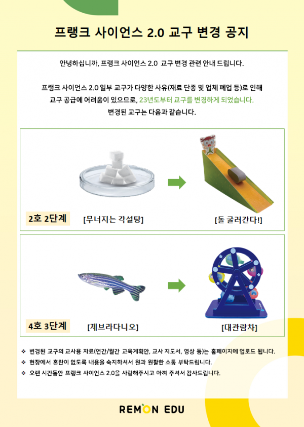 프랭크사이언스2.0 프랭크 사이언스 2.0 2호 2단계, 4호 3단계 교구 변경 공지 페이지 정보 작성자 아이온 댓글 0건 조회 3,094회 본문 [프랭크 사이언스 2.0 교구 변경 안내]안녕하세요.프랭크 사이언스 2.0 일부 교구가 여러가지 사유로 인해 교구 공급에 어려움이 있어 23년도부터 교구를 변경하게 되었습니다.<교구 변경 사항>- 2호 2단계 무너지는 각설탕 ▶ 돌 굴러간다- 4호 3단계 제브라다니오(생태) ▶ 대관람차감사합니다. 검색 목록 다음글프랭크 사이언스 2.0 생태교구 안내문 (장수풍뎅이, 달팽이, 강낭콩, 매향버섯, 개운죽) 23.03.22 댓글목록 댓글 등록 시, 로그인이 필요합니다. 로그인 댓글목록 등록된 댓글이 없습니다.